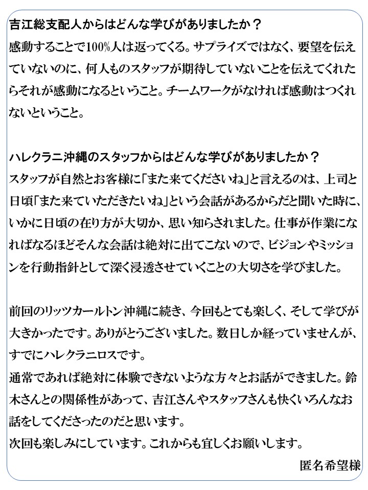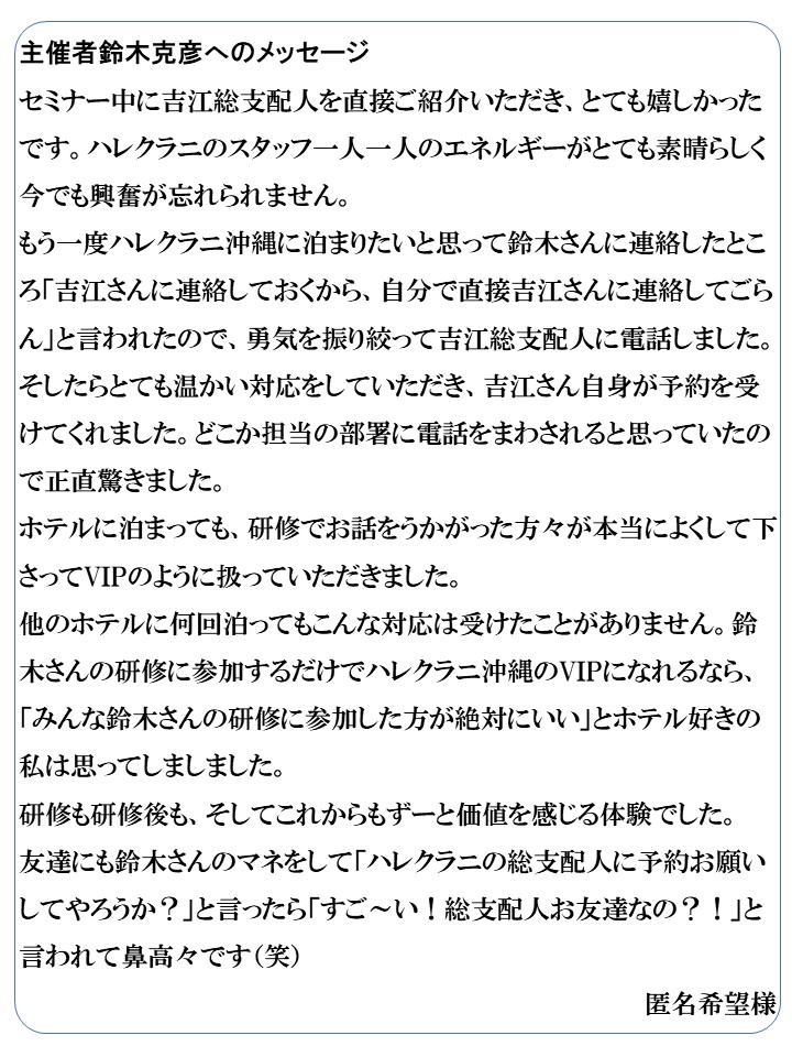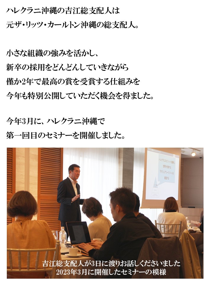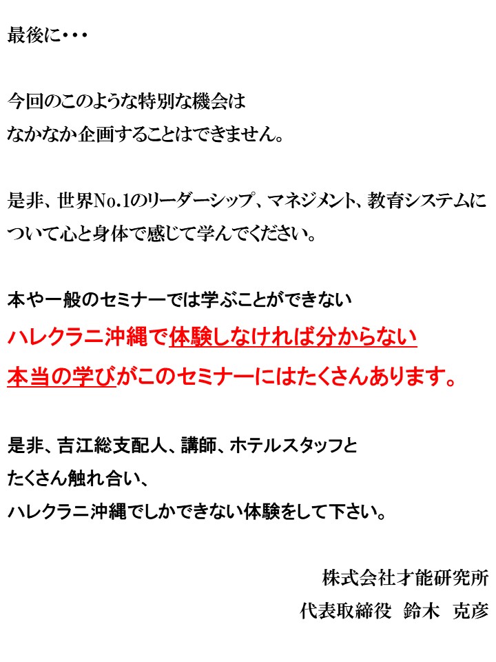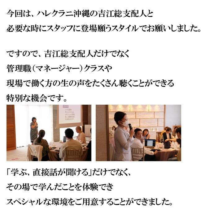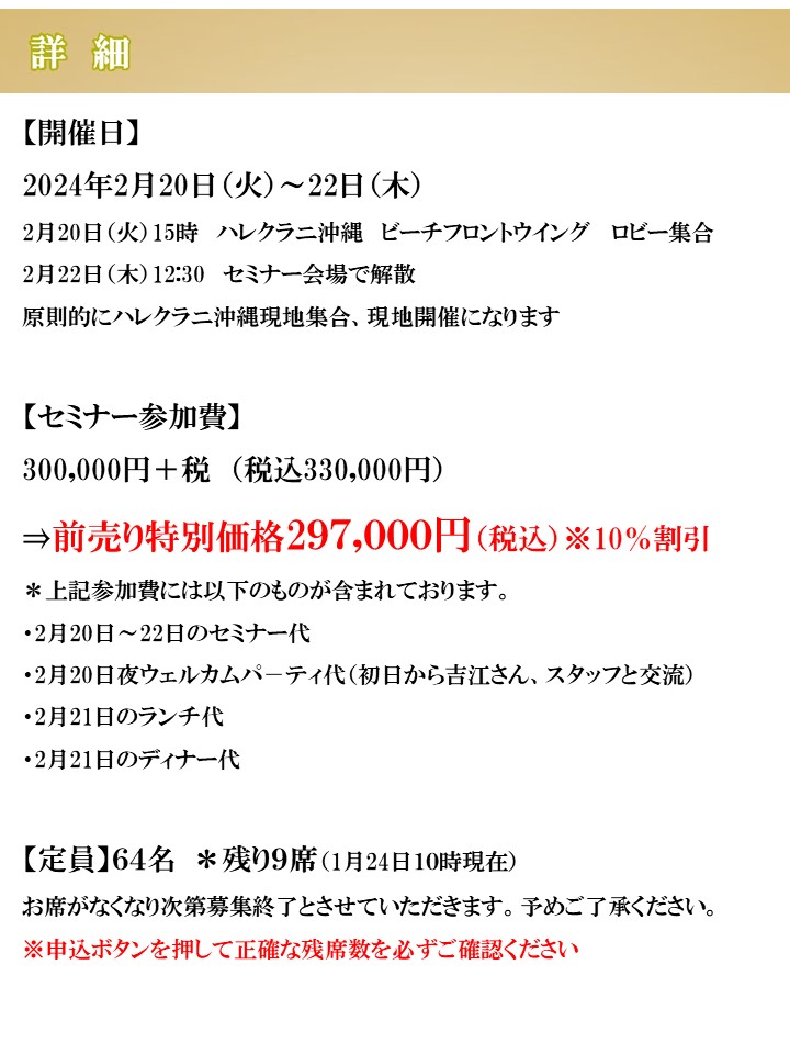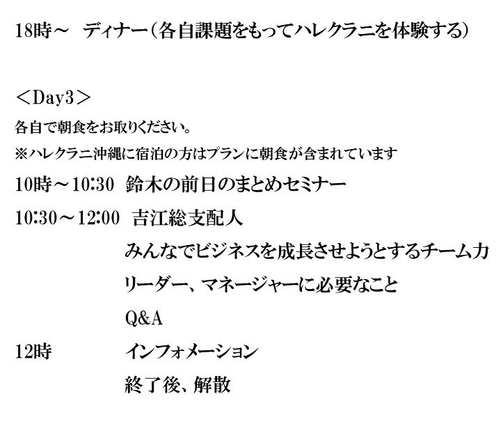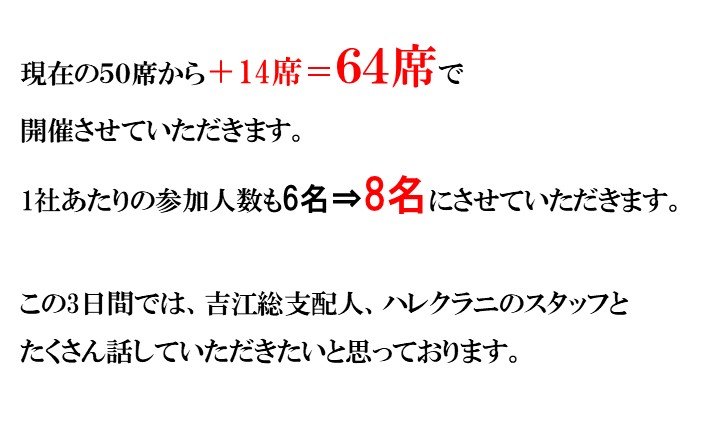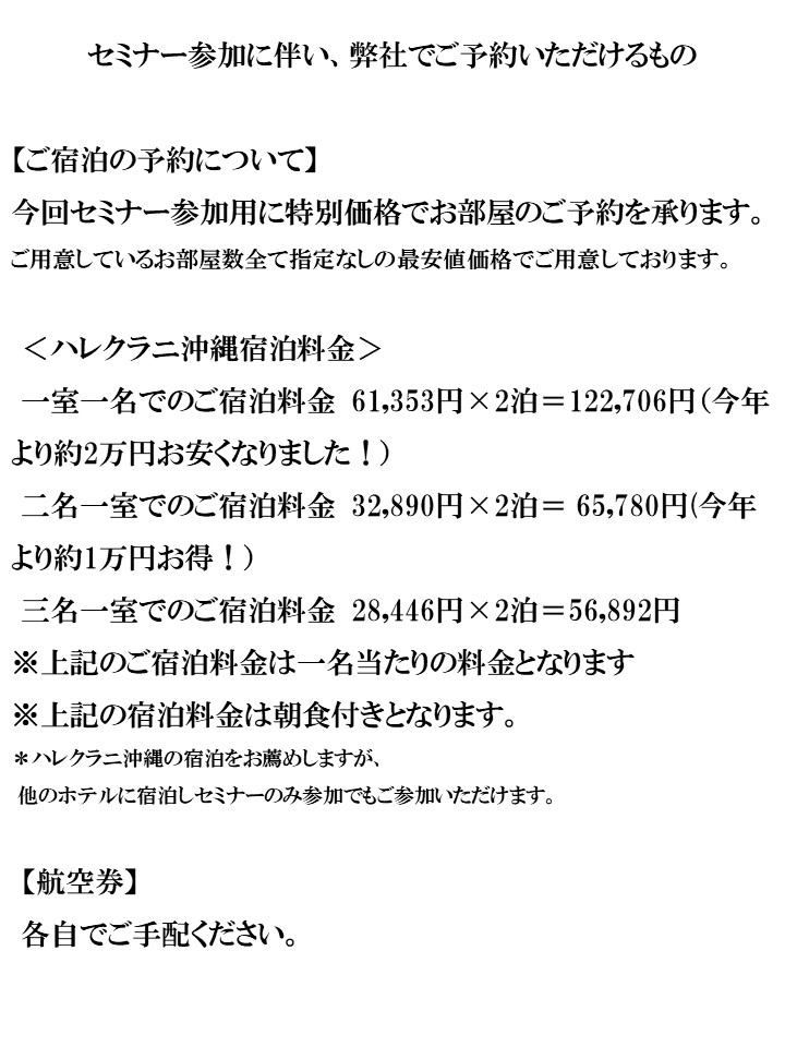 ホテル側のご好意で特別に開催をさせていただいております。 もし、可能であれば、日程調整をしていただき、今回お申込みをいただけばと思っております |