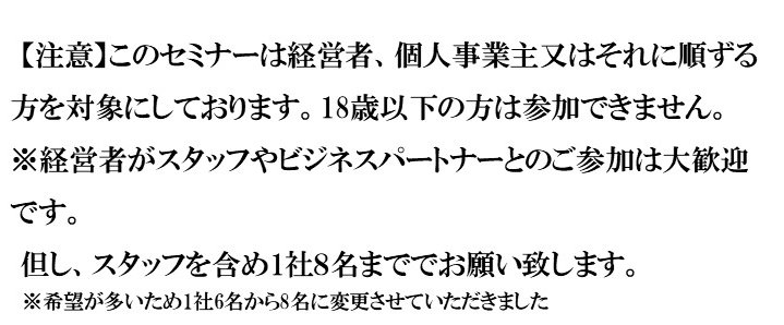 今回のセミナーは、経営者、個人事業主又はそれに順ずる方を対象にしております。18歳以下の方は参加できません。 経営者がスタッフやビジネスパートナーとのご参加は大歓迎です。 職種は多種多様な方に既にお申込みをいただいております。 ・飲食業の方